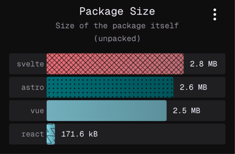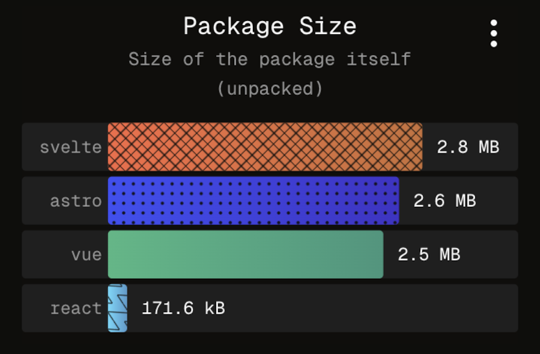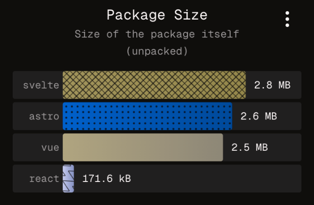 The screenshots above simulate different sorts of colour blindness (not exhaustive). It is clear that without patterns, some series would be very hard if not impossible to distinguish, and in the context of a dashboard where the same chart and colour legend is repeated, require a constant effort to reconcile the legend label with the corresponding bar. On npmx, users can compare packages, and toggle from a table view to a charts view, featuring the aforementioned horizontal bar charts. Except for the first series, all are assigned a unique pattern, to facilitate a more effortless recognition. I do believe it also helps people without colour blindness as well. Accessibility makes the web better for everybody.