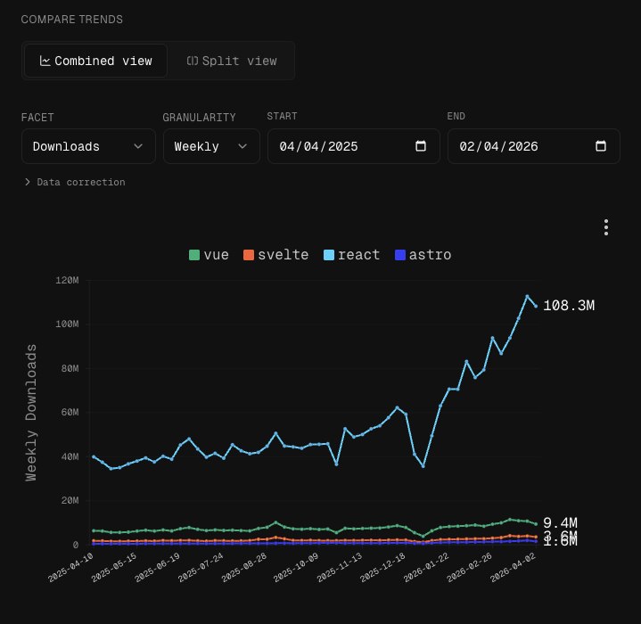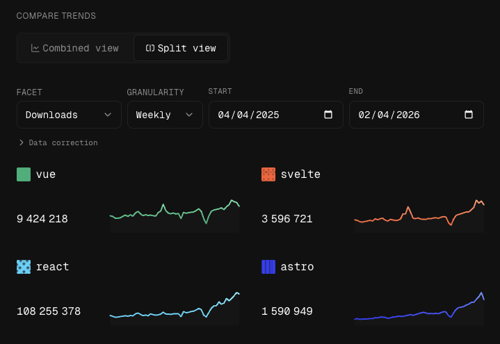 Sharing chart screenshots on socials is great. It is even better when pictures have a nice descriptive ALT text, to accomodate users with visual deficiencies. To that end, vue-data-ui has a built-in feature to create ALT texts from the visible dataset. In npmx, the feature is available from the chart's contextual menu, and generates a short analysis of the chart at hand, that can be pasted in the ALT description of social posts.